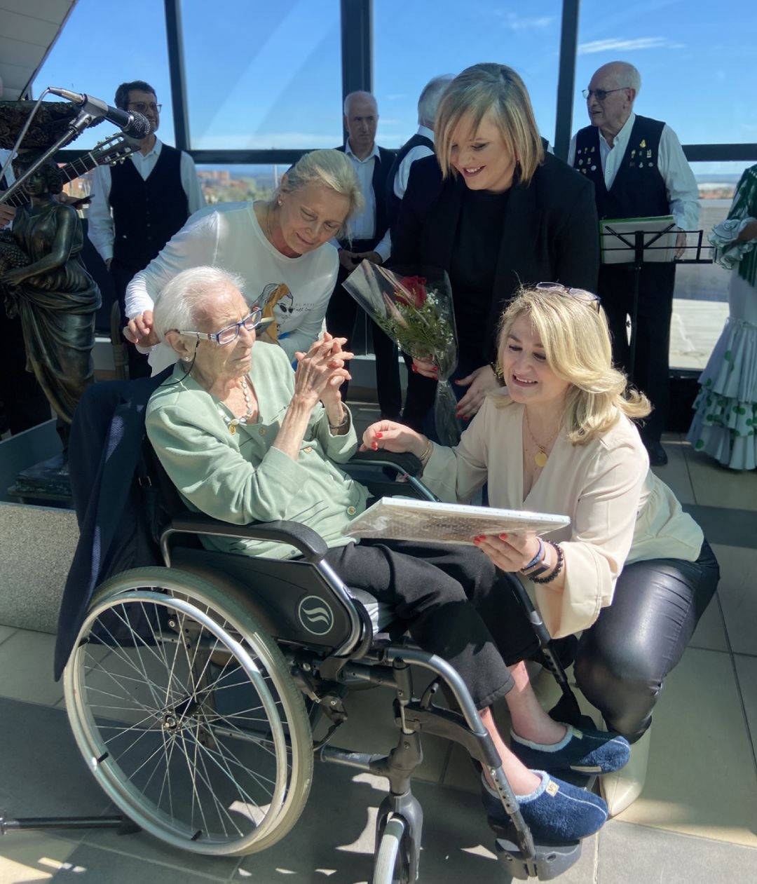 Sonia del Amo Pato, acompañada por Rocío Martín, directora de DomusVi Tres Cantos ha participado junto a residentes, cuidadores y familiares de un encuentro que ha contado con la actuación del coro del Centro Municipal de Mayores de Tres Cantos. Asimismo, ha sido partícipe de la entrega de un detalle conmemorativo a los cinco residentes homenajeados.