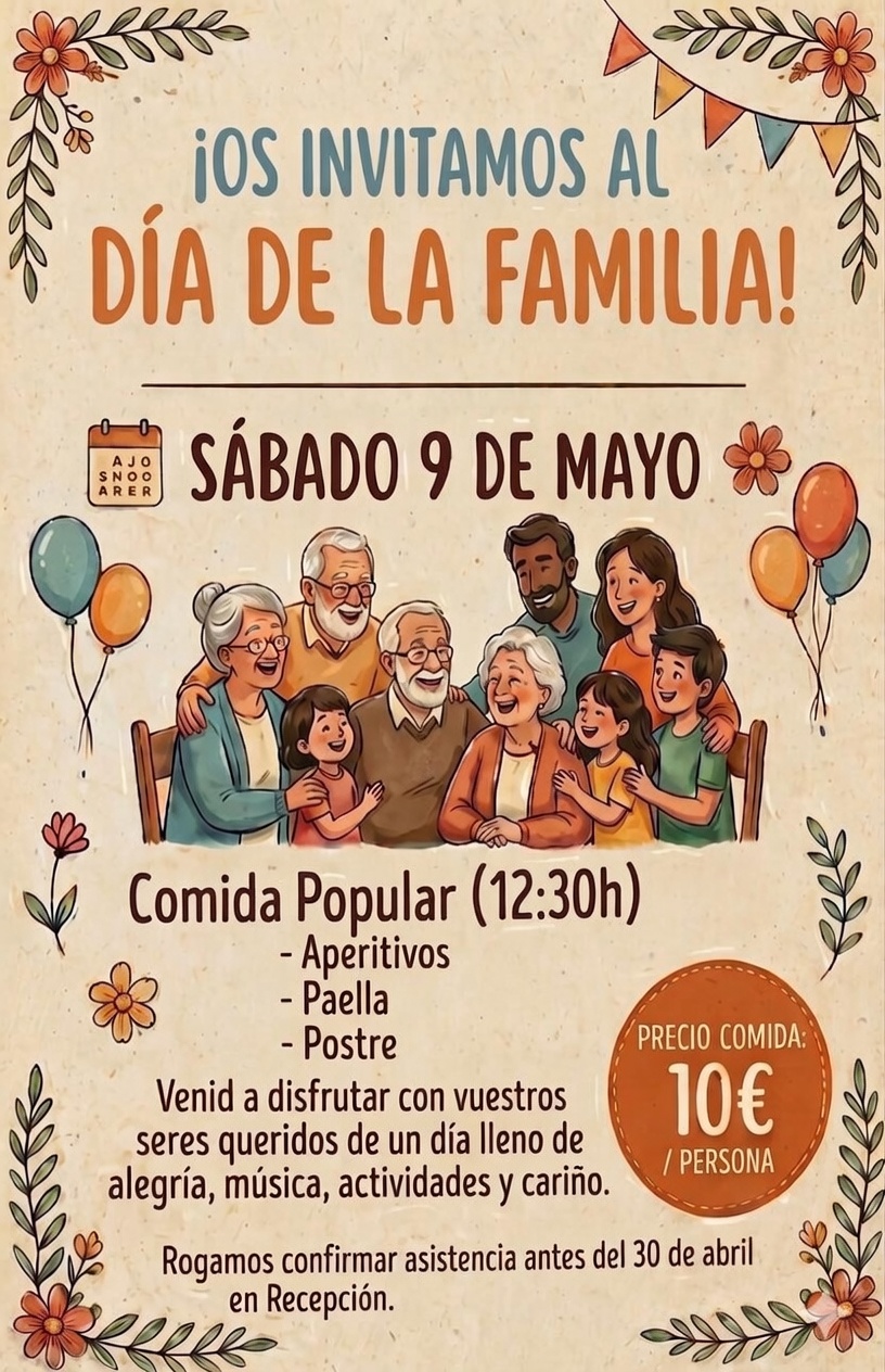 !Os invitamos al Día de la Familia! El sábado 9 de Mayo celebraremos juntos el Día de la Familia en nuestro centro, y nos encantaría que pudierais disfrutar de este día tan especial junto a vuestrxs seres queridxs. Será una jornada llena de alegría, cariño, música y actividades pensada para que abuelos, padres, hijos y nietos pasen un rato inolvidable en familia. Detalles de la celebración: Fecha: Sábado 9 de mayo Comida popular a aprtir de las 12.30 horas Menú: aperitivos, deliciosa paella y postre Precio: 10€ por persona Además habrá música, actividades y sobre todo mucho cariño y buen ambiente para fortalecer los lazos familiares. Venid a compartir risas, conversaciones y momentos especiales con las personas que más queréis. ¡Os esperamos con los brazos abiertos para celebrar lo más bonito que tenemos: la familia!