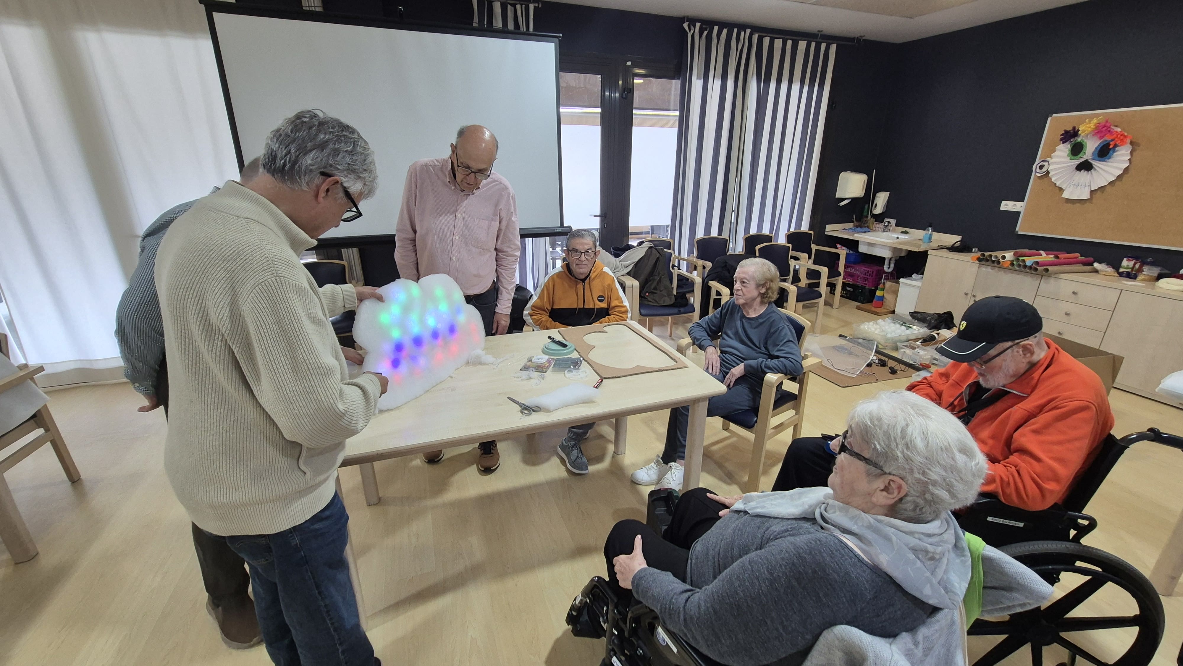 Durante dos días hemos vivido en la residencia DomusVi Costa d’en Blanes una experiencia tan enriquecedora como inspiradora: un taller de creación de elementos de estimulación sensorial de bajo coste que ha superado todas nuestras expectativas. Esta iniciativa ha sido posible gracias a la colaboración totalmente desinteresada del colectivo Sacosta.cat, cuyo compromiso, conocimiento y cercanía han hecho de estas jornadas algo realmente especial. Su enfoque práctico y accesible nos ha permitido descubrir que la innovación no siempre requiere grandes recursos, sino creatividad, ganas de aprender y trabajo en equipo. Durante el taller, profesionales del centro y algunos de nuestros residentes hemos participado activamente en el proceso de diseño y creación de distintos elementos de estimulación sensorial. Entre ellos, hemos aprendido a fabricar lámparas sensoriales utilizando materiales sencillos, muchos de ellos reciclados, demostrando que es posible dar una segunda vida a objetos cotidianos con un propósito terapéutico. Además, nos hemos introducido en el uso de luces LED y controladores bluetooth, herramientas que nos permiten personalizar los estímulos lumínicos según las necesidades de cada persona. Todo ello gestionado a través de aplicaciones de código abierto, lo que facilita su adaptación, mejora y uso continuado sin depender de soluciones comerciales costosas. Más allá del aprendizaje técnico, estas jornadas han sido una oportunidad para compartir, colaborar y reforzar vínculos entre residentes y profesionales. Ver la implicación, la curiosidad y la ilusión de todos los participantes ha sido, sin duda, uno de los aspectos más valiosos de la experiencia. Queremos agradecer profundamente a Sacosta.cat su generosidad y dedicación. Gracias a iniciativas como esta, seguimos avanzando hacia un modelo de atención más innovador, participativo y centrado en la persona. Sin duda, este taller marca el inicio de nuevos proyectos que seguirán fomentando la creatividad y el bienestar en nuestro centro.