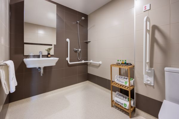 Habitación compartida equipada con camas articulables, baño propio, sistema de aviso y televisión.